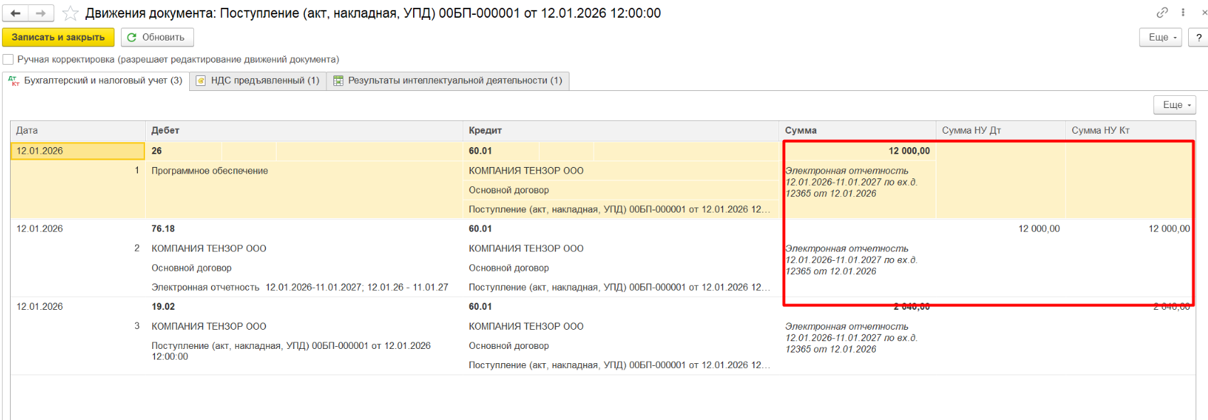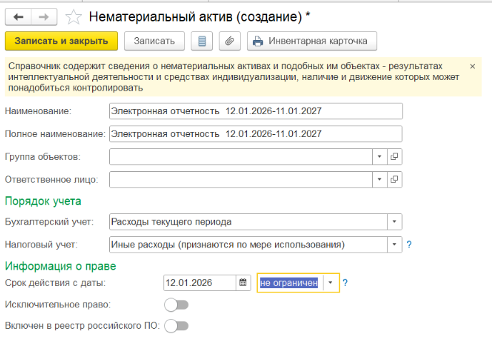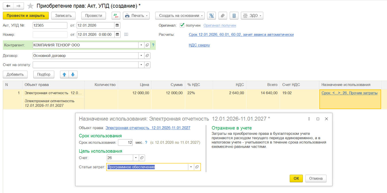 В нашем примере мы рассмотрим приобретение лицензии использования электронной отчетности сроком на 1 год.