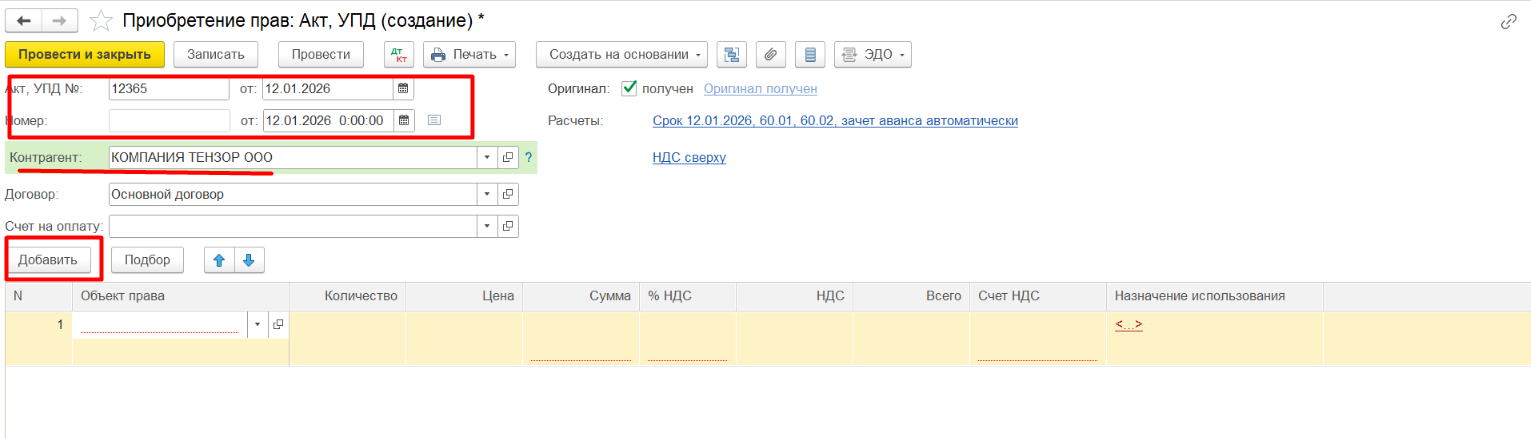 - В открывшемся документе заполняем поля: № Акт, УПД, дата, контрагент, договор. В табличной части нажимаем кнопку "Добавить",